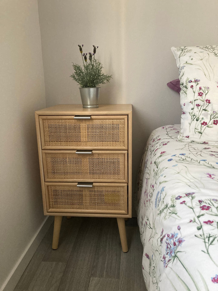 ✔️Fonction: Con su diseño escandinavo y su estructura en madera maciza, la mesa NAGOYA tiene todo lo necesario para alegrar su hogar. Comedor, dormitorio, estudio o salón, encontrará su lugar en su hogar. Sus 3 cajones de ratán/caña ofrecen opciones de almacenamiento prácticas y con estilo. Los tiradores de metal tienen un acabado cromado. Versátil, puede utilizarse como cómoda, mesilla de noche, mesa auxiliar o incluso como extremo de un sofá.