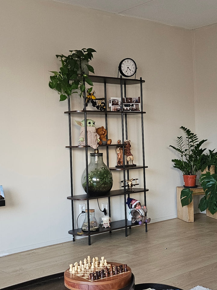 ✔️Durabilité: Su estructura metálica con acabado epoxi negro y sus estantes en madera garantizan estabilidad y resistencia a los golpes.