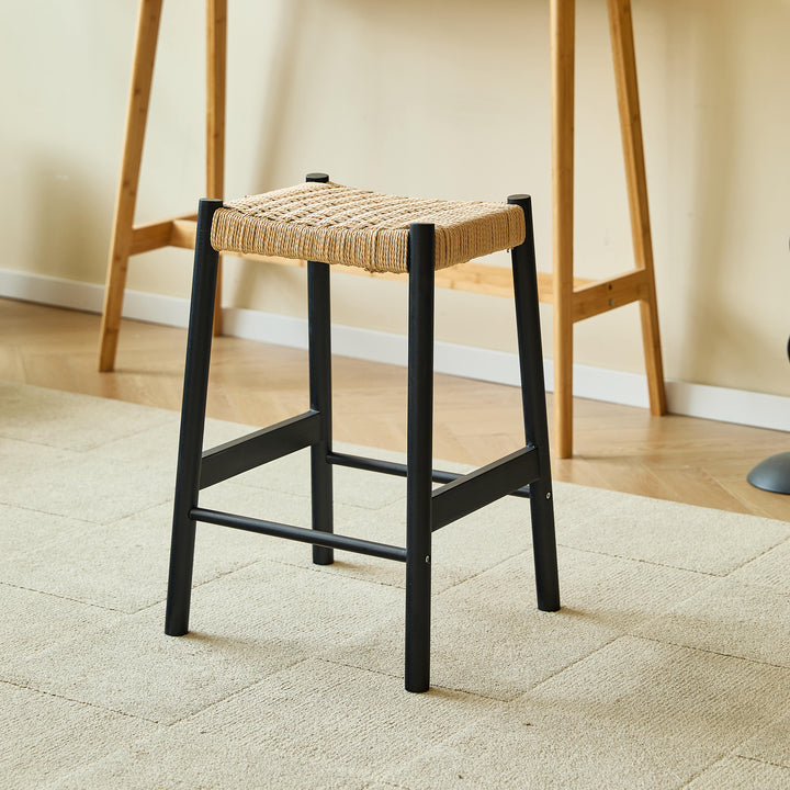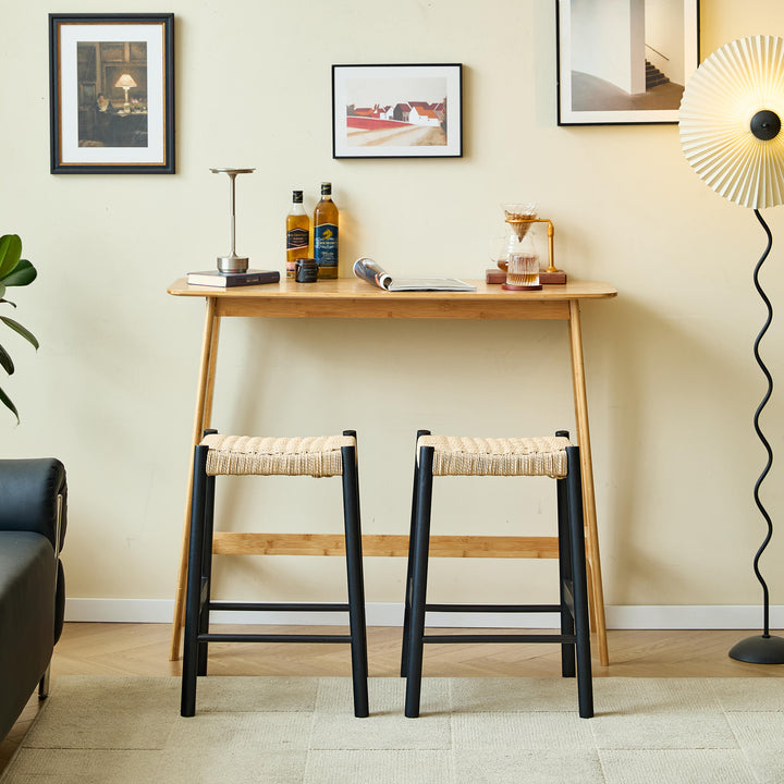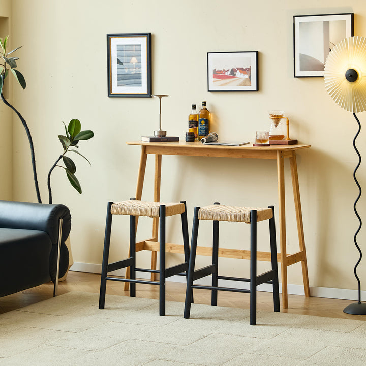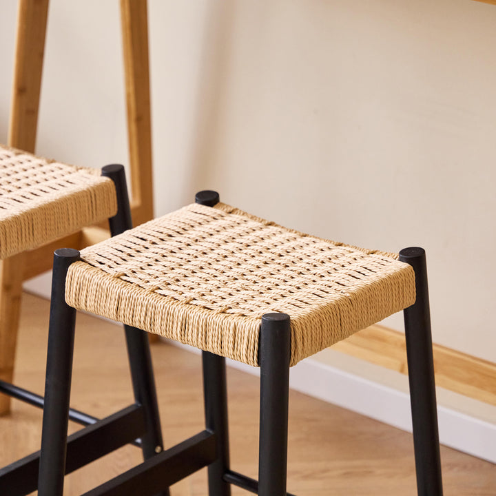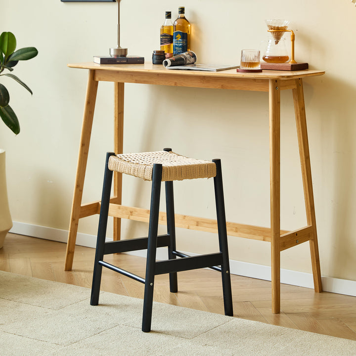 Los taburetes SALTA de madera maciza y cuerda son perfectos para añadir un toque escandinavo a tu interior. Estos taburetes combinan comodidad y durabilidad gracias a su estructura de madera maciza de caucho con certificación FSC. Su diseño atemporal los convierte en un elemento decorativo por derecho propio, además de ser prácticos y funcionales. De fácil mantenimiento, estos taburetes encajarán perfectamente en su cocina o bar, aportando calidez y convivencia a sus espacios de vida. Con su color negro y su acabado en madera de calidad, estos taburetes de bar encajarán en cualquier estilo de decoración. Regálese estos taburetes de bar escandinavos y relájese con estilo.
