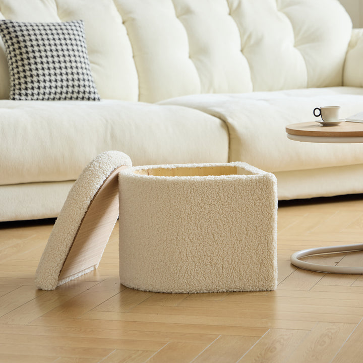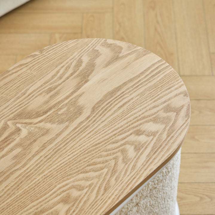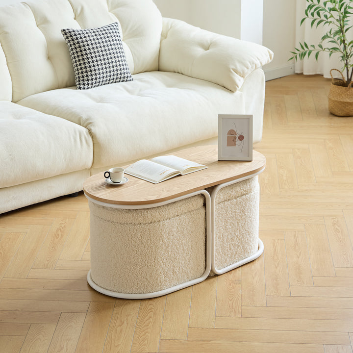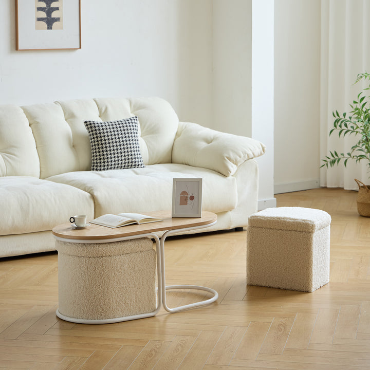 SENJA - Set d'une table basse en bois et 2 poufs en bouclettes blanches